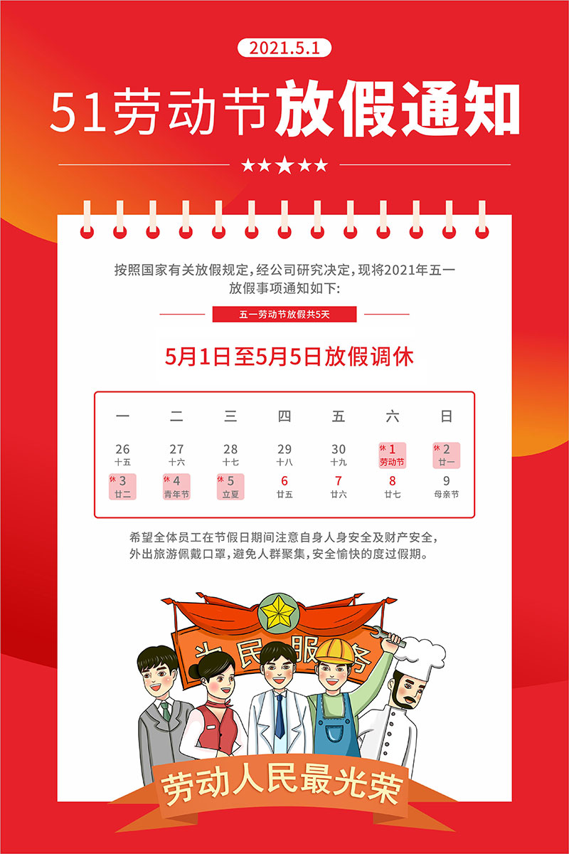 五一將至,根據(jù)《國務院辦公廳關于2021年部分節(jié)假日安排的通知》,結合我公司實際情況,經公司研究決定,現(xiàn)將公司五一放假安排如下5.1到5.5放假5天。